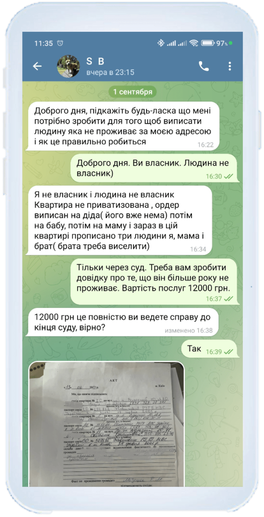 Мои адвокатские услуги по выписке человека обойдутся вам от 8000 грн. до 16 000 грн. в зависимости от сложности судебного дела. Конкретную таблицу расценок очень тяжело установить, поскольку сложность каждого дела по выписке или выселению разная, соответственно и разный оббьем работы необходимо проделать. Например, в одном судебном деле по выселению или выписке достаточно написать в суд обычный иск на две страницы, а в другом деле такой иск необходимо написать на пятнадцать страниц плюс подать несколько других ходатайств. Соответственно цена услуги будет разная. Поэтому самый простой вариант узнать стоимость услуги, это написать мне на Telegram. Просто опишите мне в Telegram какая помощь вам нужна, сфотографируйте и пришлите документы, которые у вас есть, а я в свою очередь напишу вам стоимость услуг. Всё довольно просто.
